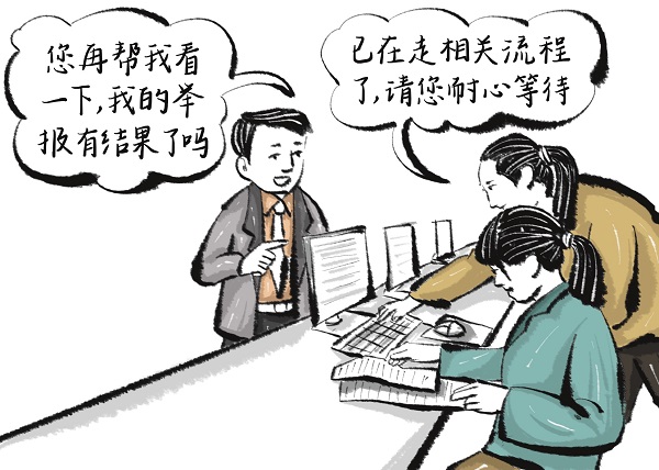 溫馨提醒:一些舉報人很心急,認為多到紀檢監察機關來訪接待場所反映幾次,就可以達到催辦的效果,否則辦理結果就可能“千呼萬喚始出來”。這種擔心沒有必要。對受理的每一件舉報件,紀檢監察機關辦理人員都會依規依紀依法認真辦理,爭取早查結、早回復。當然,舉報件的調查處置要講規定、講程序、講事實、講證據,從舉報受理到調查處理完畢,有一個紀定法定程序和過程。紀檢監察機關也在不斷地優化工作機制,大力提高舉報件辦理工作的效率和質量。