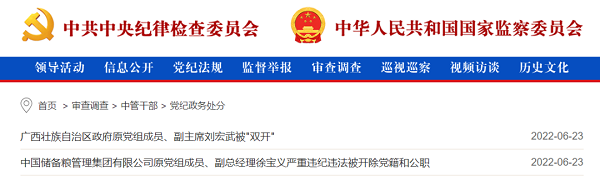 中國儲備糧管理集團有限公司原黨組成員、副總經理徐寶義嚴重違紀違法被開除黨籍和公職。