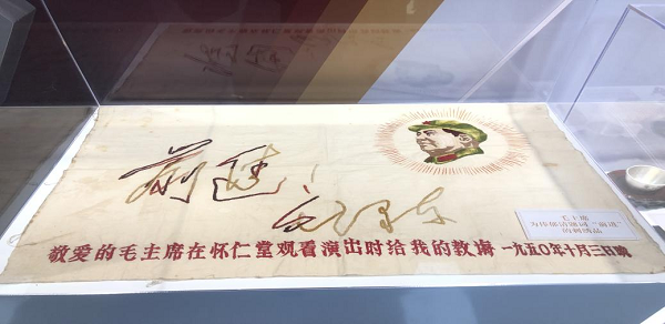 1950年10月,毛主席為普洱地區參加國慶一周年觀禮團成員傣族代表俸郁清題詞“前進”,主題展區展柜內展示了該題詞刺繡品。