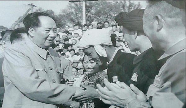 1950年的國慶觀禮期間,毛主席在接見普洱地區各民族代表,毛主席接見佤族代表拉勐并親切握手,拉勐向毛主席敬獻了佤族剽牛用的梭鏢。毛主席握住拉勐的手關切地問:“聽說你們佤族有砍人頭祭祀的習慣,可不可以把砍人頭的習慣改掉。”拉勐牢牢記住了毛主席的話,回去以后歷盡艱辛,帶領族人把延續千年砍人頭祭祀的習慣改為現在的牛頭祭谷。