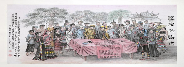 赴京觀禮團回到普洱后,各民族代表和黨政軍領導歡聚一堂,共商民族團結大計。1951年元旦,按照佤族的傳統習俗,在普洱紅場舉行了剽牛儀式。儀式上,盟誓立碑的發起人之一拉勐作為執槍剽牛者沉穩上前,矯健剽牛,一剽即中。被剽的牛朝左倒下,昂揚的頭向南擺去,鮮紅的血朝上噴注,吉祥征兆兀然呈現!剽?,F場沸騰了......拉勐又唱又跳,激動得滾到地上,邊滾邊喊:“共產黨猛!毛主席猛!”意思就是“共產黨好!毛主席好!”隨后,代表們舉行了喝咒水儀式,盟誓立碑,以志其事。水粉畫《堅定的誓言》真實再現了各民族代表在民族團結誓詞碑上簽名的場景。
