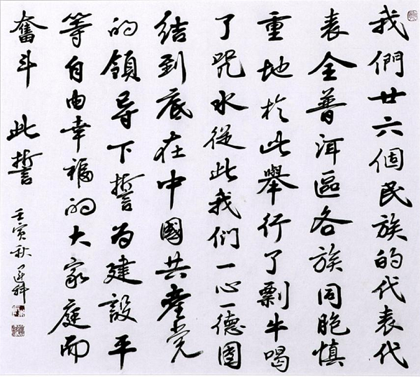 普洱本土書法家陳運科潑墨書寫了民族團結誓詞碑碑文:“我們廿六個民族的代表,代表全普洱區各族同胞,慎重地于此舉行了剽牛,喝了咒水。從此,我們一心一德,團結到底,在中國共產黨的領導下,誓為建設平等自由幸福的大家庭而奮斗!此誓。”“永遠跟著共產黨走”8個大字,是在國民黨殘余勢力盤踞在邊疆的復雜環境下叫響的,體現了普洱各民族同胞團結一心,追隨毛主席、追隨共產黨的信心和決心!