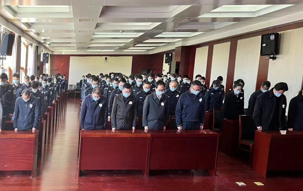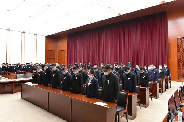 參加集中收看的全體人員身著素裝,佩戴白花,全程肅立,懷著悲痛的心情收看大會直播,認真聆聽習近平總書記致悼詞。