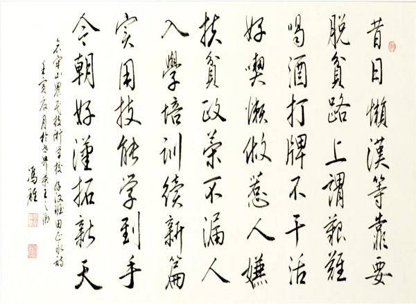 書法作品《好漢班》書寫的是鎮(zhèn)沅彝族哈尼族拉祜族自治縣在開展脫貧攻堅過程中,以“不落下一戶貧困家庭,不丟下一個貧困群眾,但也絕不養(yǎng)一個懶漢”的決心和意志,通過開設(shè)實用技能培訓(xùn)“好漢班”,把三千多個“等靠要”思想嚴(yán)重的懶漢變好漢,幫助他們掌握實用技術(shù),靠自己脫貧致富的真實故事。