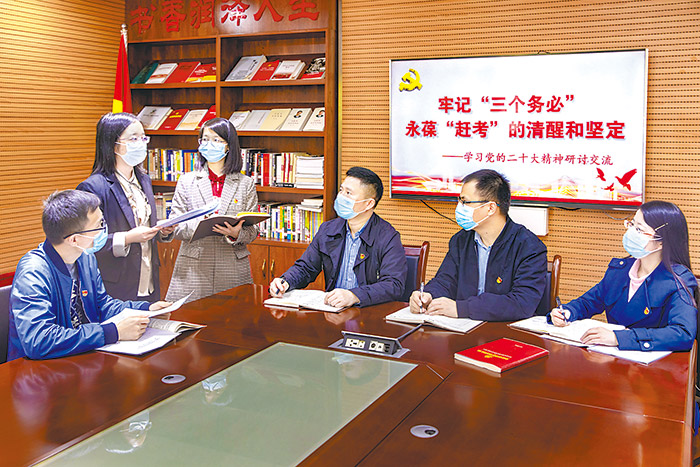 在中央紀委常委會堅強領導下,中央紀委國家監委機關堅持常委會和班子成員領學、機關黨委督學、基層黨支部研學、黨小組促學、黨員自學“五學聯動”,建立完善常態化、全覆蓋學習機制,推動機關黨員干部完整、準確、全面學習領會黨的二十大精神,自覺用黨的創新理論凝心鑄魂。機關各基層黨組織利用線上線下多種方式,開展內容豐富、生動靈活、持續深入的學習活動,推動學習宣傳貫徹不斷走深走實。
