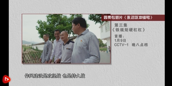 四集電視專題片《永遠吹沖鋒號》第三集《鐵規矩 硬杠杠》,將于1月9日在中央電視臺綜合頻道晚8點檔播出。