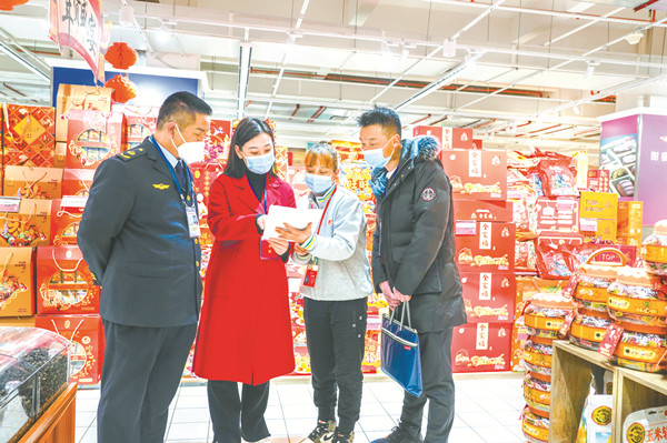 春節臨近,云南省宜良縣紀委監委采取專項檢查、隨機抽查、明察暗訪等方式,排查公款購買禮品、違規吃喝、公車私用等問題線索,嚴防“四風”問題反彈回潮。圖為近日,專項檢查組在某超市了解相關情況。易盛芳 攝