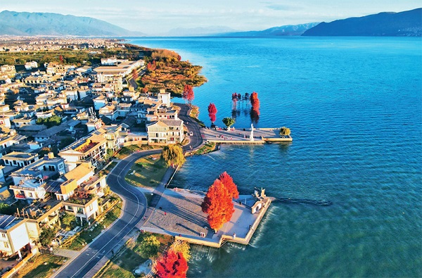 云南省牢記習近平總書記對洱海保護“立此存照,過幾年再來,希望水更干凈清澈”的囑托,加大洱海保護治理力度,取得明顯成效。圖為2022年11月28日,大理白族自治州洱海生態廊道上的龍龕碼頭。云南日報供圖黃興能/攝