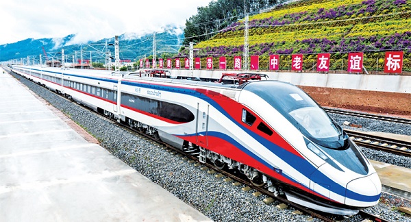 2021年12月3日,中老兩國互利合作的旗艦項目和高質量共建“一帶一路”的標志性工程——中老鐵路全線通車。圖為“瀾滄號”動車組列車正在駛過中老鐵路磨憨站。云南日報供圖陳暢/攝