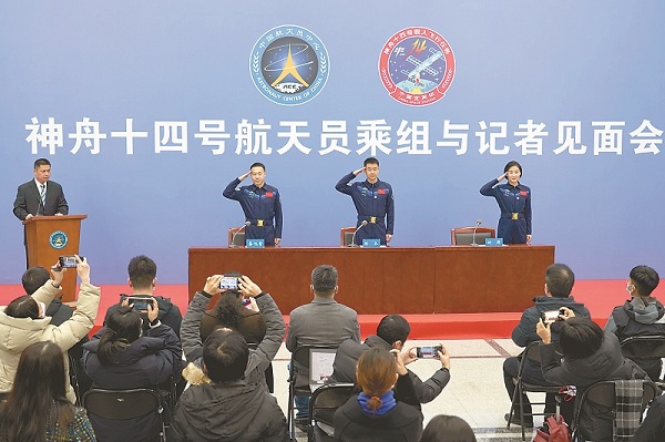 2月17日,神舟十四號航天員乘組與記者見面會在北京航天城舉行。這是航天員陳冬(右二)、劉洋(右一)、蔡旭哲(右三)敬禮致意。新華社記者 郭中正 攝