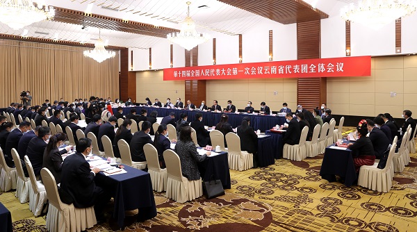 3月9日下午,出席十四屆全國人大一次會議的云南省代表團舉行全體會議,審議有關草案,醞釀協商國家機構組成人員人選。