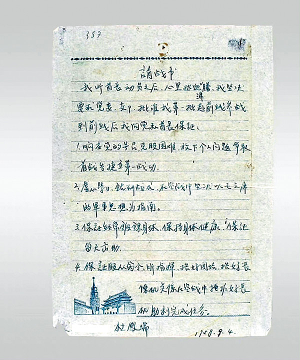 空戰(zhàn)英雄杜鳳瑞的請戰(zhàn)書。