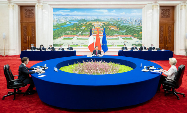 4月6日下午,國家主席習近平在北京人民大會堂同法國總統馬克龍、歐盟委員會主席馮德萊恩舉行中法歐三方會晤。 新華社記者 翟健嵐 攝