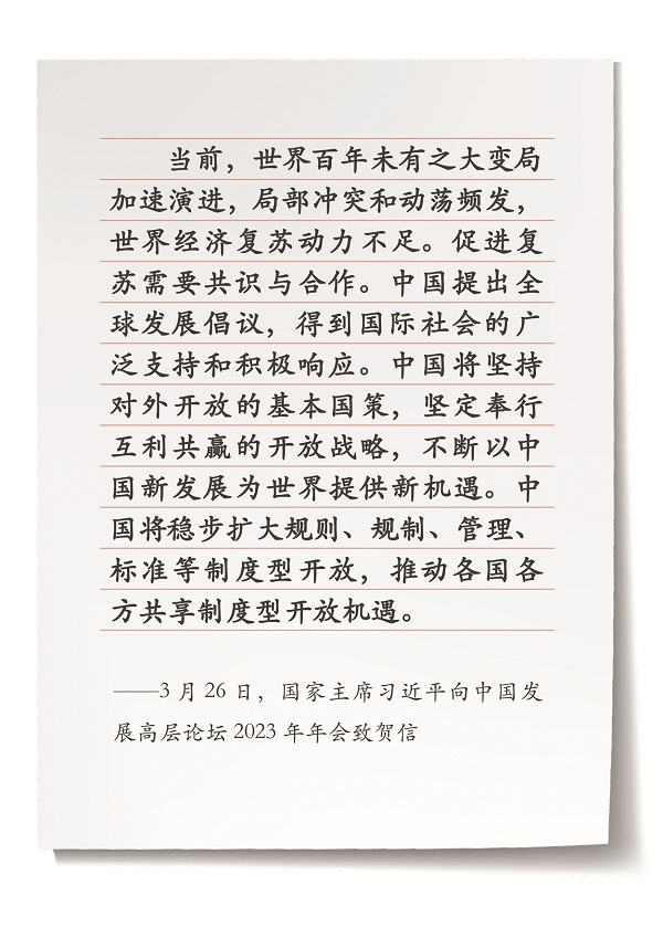 “中國將堅持對外開放的基本國策,堅定奉行互利共贏的開放戰略,不斷以中國新發展為世界提供新機遇。中國將穩步擴大規則、規制、管理、標準等制度型開放,推動各國各方共享制度型開放機遇。”3月26日,習近平總書記向中國發展高層論壇2023年年會致賀信,再次釋放出中國堅持對外開放并不斷為世界提供新機遇的強烈信號。