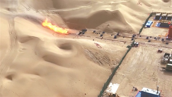 5月2日,順北10斜井已經(jīng)鉆探完畢,井深8591米,正式放噴點(diǎn)火,測(cè)試這口井是否有油氣流。(視頻截圖) 圖片來(lái)源:視覺(jué)中國(guó)