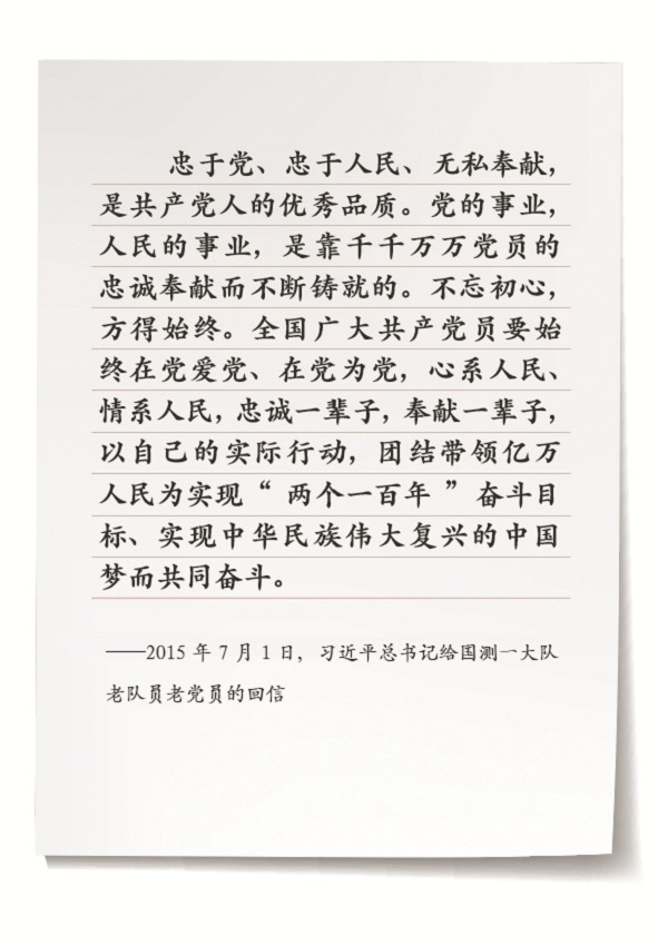 2015年7月1日,習近平總書記給國測一大隊老隊員老黨員回信,充分肯定他們愛國報國、勇攀高峰的感人事跡和崇高精神,對全國測繪工作者和廣大共產黨員提出“不忘初心,方得始終”“忠誠一輩子,奉獻一輩子”的殷切希望。7年多來,國測一大隊以回信精神為指引,不畏艱險、迎難而上,勝利完成黨和國家交辦的各項任務,不斷開拓事業發展新局面。