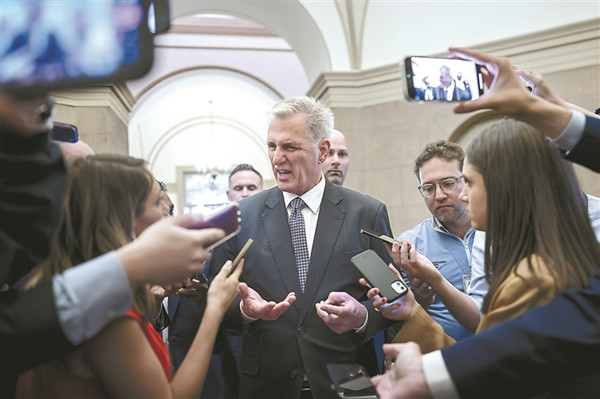 當?shù)貢r間5月22日,美國總統(tǒng)拜登會見共和黨眾議院議長凱文·麥卡錫,就提高美國債務上限進行新一輪會談,但尚未達成協(xié)議。圖為當日,美國眾議院議長麥卡錫抵達國會大廈時接受媒體采訪。 圖片來源:視覺中國
