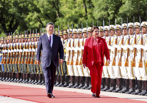 6月12日下午,國家主席習近平在北京人民大會堂同來華進行國事訪問的洪都拉斯總統卡斯特羅舉行會談。這是會談前,習近平在人民大會堂東門外廣場為卡斯特羅舉行歡迎儀式。 新華社記者 劉彬 攝