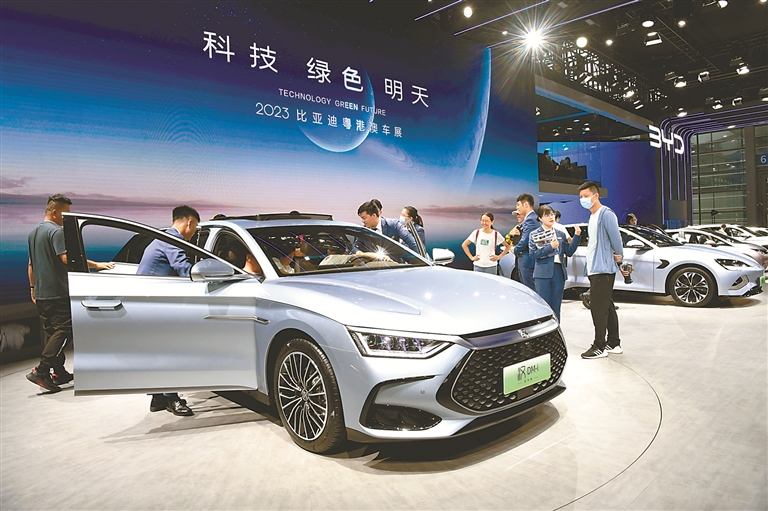 近日,2023(第二十七屆)粵港澳大灣區國際汽車博覽會暨新能源汽車博覽會(簡稱粵港澳大灣區車展)在深圳會展中心開幕。本屆車展以“先行向未來”為主題,100余家中外汽車品牌攜1000余款車型集中亮相。圖為6月16日,觀眾在粵港澳大灣區車展比亞迪展臺了解新能源汽車。新華社記者 梁旭 攝