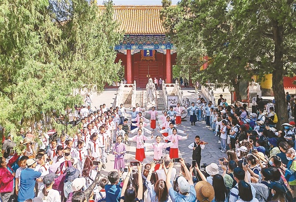 2023年5月18日,北京,國際博物館日,孔廟舉辦集體誦讀活動,觀眾重溫儒家經典《禮運大同篇》。 圖片來源:視覺中國