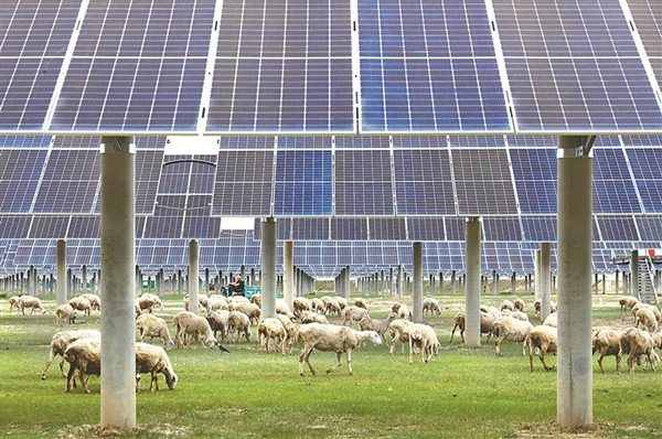 近年來,河北省張家口市大力推進清潔能源開發利用,推動新能源項目建設,助力綠色低碳發展。截至目前,張家口市風電、光伏發電等清潔能源裝機容量達2756萬千瓦,約占電源總裝機容量的80%。圖為近日,在張家口市康保縣張紀鎮,羊群在光伏板下覓食。 新華社記者 楊世堯 攝