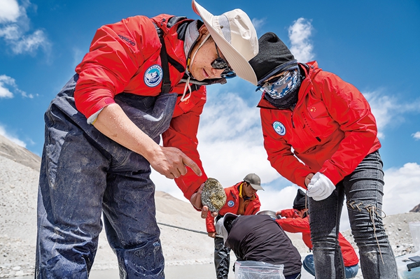 2023年珠峰地區綜合科學考察研究,是第二次青藏高原綜合科學考察研究的一部分。今年5月,來自5支科考分隊13支科考小組的170名科考隊員,在珠峰地區探索自然,追問科學,奮勇攀登。圖為科考隊員張繼峰(左)在查看附著在石頭上的藻類生物。 新華社記者 孫非 攝