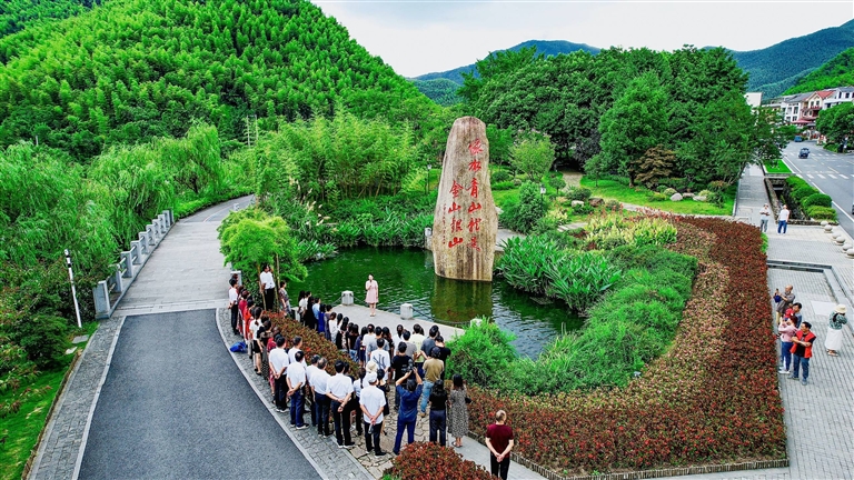 在浙江省安吉縣天荒坪鎮余村,“綠水青山就是金山銀山”理念已深入人心,為了進一步宣傳好這一理念,余村專門組成了“余村故事”講解團。圖為近日,“余村故事”講解團成員在“綠水青山就是金山銀山”石碑前為游客講述余村的發展故事。殷興華 攝