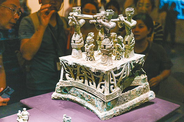 尊和罍?zhǔn)窍纳涛拿鞯牡湫推魑铮B足神像則是三星堆先民的創(chuàng)造。“在中國(guó)古代神話中,鳥是溝通天地人神的使者,人鳥合一的形象被賦予了神性。這一罕見的青銅藝術(shù)杰作展現(xiàn)了古蜀人精湛的鑄造工藝,是中原商文化與古蜀地域文化的完美結(jié)合。”三星堆博物館副館長(zhǎng)、文物保管部部長(zhǎng)余健說(shuō)。