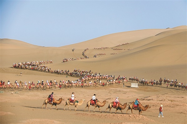 近日,甘肅省敦煌市碧空如洗,鳴沙山月牙泉景區景色如畫,引人入勝。圖為游客在月牙泉景區游覽。新華社發 張曉亮 攝
