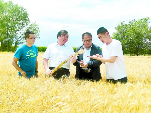 圖為劉錄祥(左二)與相關育種專家在新疆維吾爾自治區奇臺縣田間考察太空小麥品種“航麥106”長勢情況。 (中國農業科學院作物科學研究所供圖)
