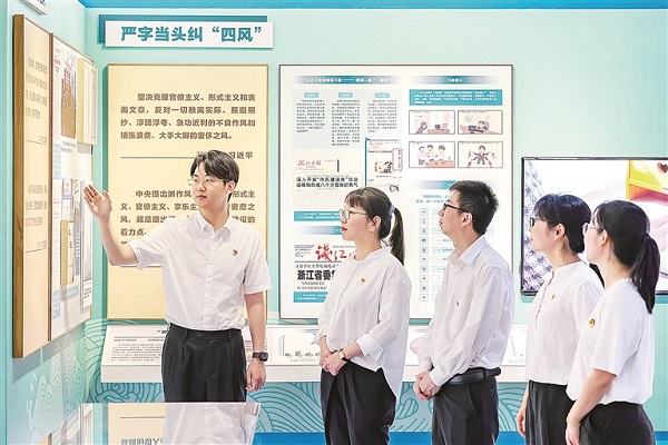 黨的十八大以來(lái),我們黨不斷推進(jìn)黨的政治建設(shè)、思想建設(shè)、組織建設(shè)、作風(fēng)建設(shè)、紀(jì)律建設(shè),把制度建設(shè)貫穿黨的各項(xiàng)建設(shè),開(kāi)展史無(wú)前例的反腐敗斗爭(zhēng),在構(gòu)建全面從嚴(yán)治黨體系上積累了豐富成果。圖為近日,浙江省淳安縣紀(jì)委監(jiān)委干部在省法紀(jì)教育基地參觀全面從嚴(yán)治黨成就展。謝航凱 攝