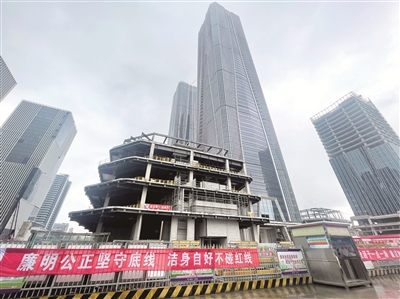 圖為近日,張江科學城“科學之門”雙子塔幕墻完成施工。在“科學之門”東塔項目圍欄上,掛著寫有廉潔宣傳語的橫幅。李宗奇 攝