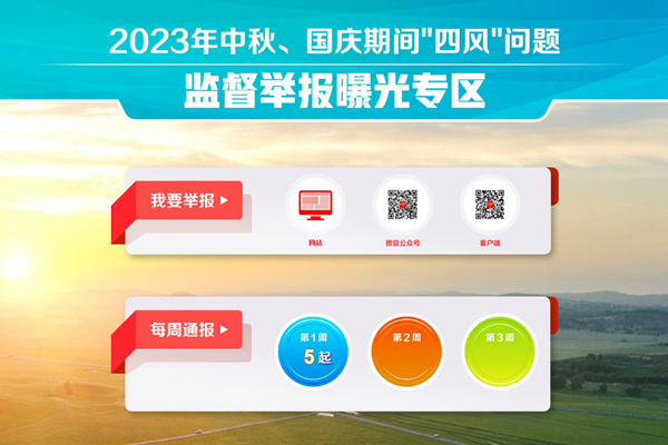 中秋、國慶節(jié)假將至,落實中央八項規(guī)定精神必須堅守節(jié)點、寸步不讓。為持續(xù)強化正風肅紀,中央紀委國家監(jiān)委網站推出“2023年中秋、國慶期間‘四風’問題監(jiān)督舉報曝光專區(qū)”,加大典型案例通報曝光力度,不斷釋放一抓到底、一刻不松的強烈信號。專區(qū)開設“我要舉報”窗口,鏈接中央紀委國家監(jiān)委統(tǒng)一舉報平臺,歡迎廣大網友通過網站、手機客戶端和微信公眾號,對公款吃喝、在隱蔽場所違規(guī)接受宴請、違規(guī)收送禮品禮金、借操辦婚喪喜慶之機斂財、公款旅游、公車私用等節(jié)日多發(fā)問題進行舉報。專區(qū)“每周通報”欄目從9月22日起,分3次集中對典型問題點名道姓通報曝光,強化警示震懾。