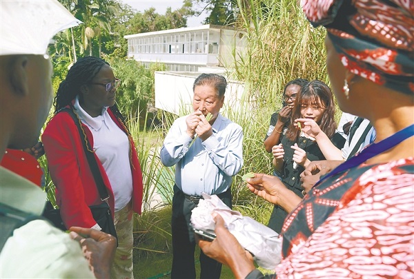 10月14日,在福建農林大學,林占熺教授(中)向參加培訓的外國學員介紹巨菌草的生物學特性。新華社記者 林善傳 攝