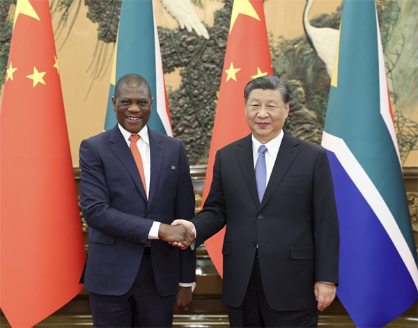 習近平指出,今年是中南建交25周年,兩國關系步入“黃金時代”。今年8月,我對南非進行了第四次國事訪問,同拉馬福薩總統一致決定,中南兩國要做高度互信的戰略伙伴、共同進步的發展伙伴、相知相親的友好伙伴、維護正義的全球伙伴。中方愿同南非一道,不斷充實中南全面戰略伙伴關系內涵,推動兩國關系再上新臺階。