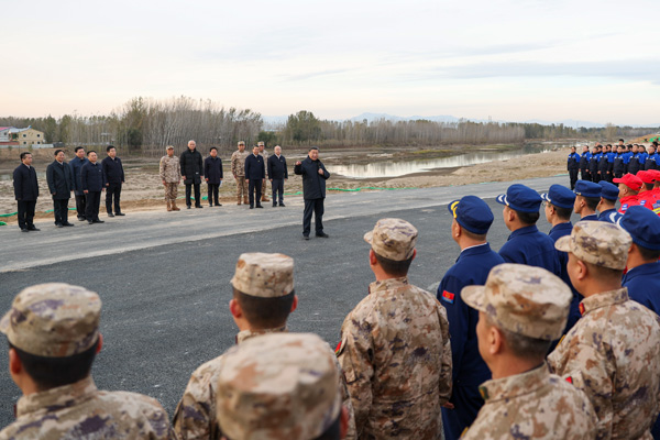 11月10日,中共中央總書記、國家主席、中央軍委主席習近平在北京、河北考察災后恢復重建工作。這是10日下午,習近平在河北保定涿州市白溝河治理工程(涿州段)考察時,同水利工程建設人員和曾經參加涿州抗洪救援的解放軍和武警部隊官兵、民兵預備役人員、消防救援隊伍等方面的代表親切交流。 新華社記者 岳月偉 攝