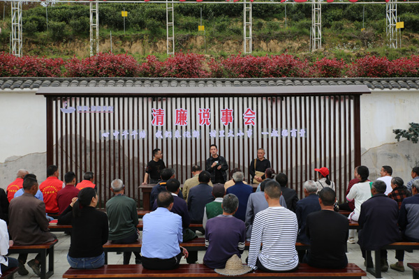 四川省萬源市紀委監委結合“清廉說事會”“清廉宣講”等活動,持續推動紀法教育下基層。圖為該市紀檢監察干部在“清廉說事會”上,向干部群眾宣講紀法知識。牟麗檠 攝
