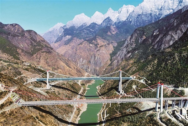 11月15日,滇藏鐵路麗江至香格里拉段實施動態檢測,全線開通運營進入倒計時。 玉龍雪山下,滇藏鐵路麗香段金沙江特大橋和高速公路特大橋并行跨越金沙江。 圖片來源:視覺中國