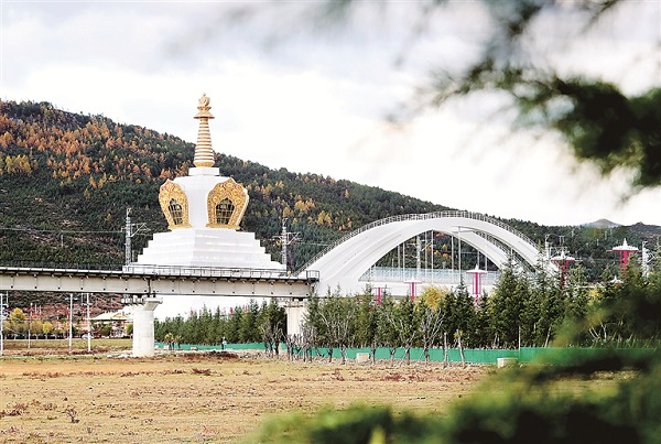 滇藏鐵路麗香段動車橋經過香格里拉標志建筑大白塔。 圖片來源:視覺中國