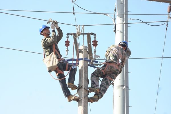 烈日下,電力工人用勤勞的雙手檢修著設備,他們用最樸實的行動和最火熱的激情履行著電力工人的職責,用辛勤的汗水守護萬家燈火。(賈建榮 攝)