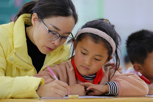 位于陸良縣邊遠山區的活水鄉雨麥紅小學,現有14位老師和227名學生。山區老師們堅守寂寥的莽莽大山,用堅守和奉獻照亮孩子們踏出山門通往絢麗夢想的征途。圖為在雨麥紅小學寬敞明亮的教室里,老師在輔導同學們做課堂作業。(王勇 攝)