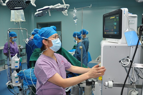 專注細致,執著堅守。個舊市人民醫院手術室內,醫護人員密切關注著患者血壓、心率變化情況,以醫者初心守護患者生命健康。(王鴻明 攝)
