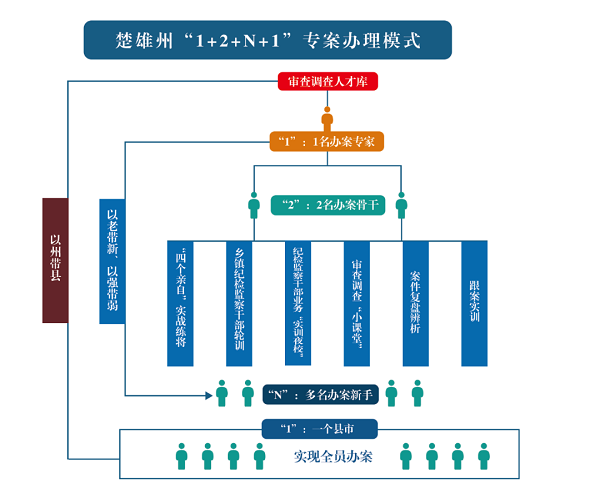 “運用‘1+2+N+1’模式辦案,改變了過去各鄉鎮紀委、縣(市)紀委監委、各派駐紀檢監察組‘單打獨斗’的作戰方式,轉變為‘聯合作戰’‘共同作戰’,大大提升了審查調查工作的質量和效率。”楚雄州紀委監委有關負責人介紹,針對全州各級紀檢監察機關辦案力量薄弱、能力不足等問題,楚雄州紀委監委牢固樹立“全員會辦案、能辦案”的理念,打破部室、機構界限,把州、縣、鄉紀檢監察干部納入審查調查人才庫,組建由“1名辦案專家負責+2名辦案業務骨干幫帶+N名新手參與+1個縣市參與”組成的專案工作組,采取“老兵”帶“新兵”的方式,幫助辦案新手在實戰中彌補知識短板、能力弱項、經驗盲區。同時,建立州、縣(市)紀委監委“一把手”“親自把好程序關、親自組織外圍調查、親自參與內審訊問、親自落實安全責任”的“四個親自”辦案工作機制,帶動鄉鎮紀委書記學業務會辦案。截至目前,全州紀檢監察機關辦案骨干增至300余人,鄉鎮紀檢監察干部參與辦案達189人次。