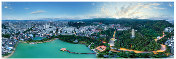 易羅池位于保山市隆陽區(qū)城西南,因泉有九竇,故又名九隆池,是保山著名的“內(nèi)八景”之一。公元69年,哀牢王柳貌率全境77個部落55萬余人歸附東漢,設(shè)立了永昌郡,成為當(dāng)時全國第二大郡,開啟了永昌文化的先河,易羅池為哀牢王族的發(fā)祥地,在它的湖畔有始建于唐代的文筆塔,湖心有明代永昌參將鄧子龍修建的濯纓亭,登高遠(yuǎn)望,塔似筆,亭如墨,池類硯,街道縱橫的城郭仿佛稿紙,數(shù)百年來一直被雅稱為“龍脈相傳的文房四寶”。