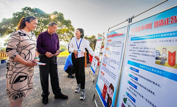 江西省吉安市永新縣紀委監委持續開展打擊誣告陷害、失實檢舉控告澄清正名工作宣傳活動,引導干部群眾規范有序檢舉控告,營造風清氣正的政治生態。圖為該縣紀檢監察干部向干部群眾宣傳澄清正名工作。周亞茂 攝