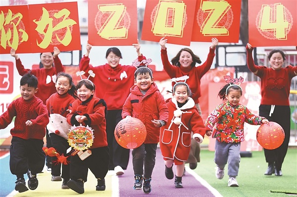 圖為2023年12月29日,山東省臨沂市郯城縣郯城街道官塘幼兒園的老師手持“你好2024”字樣,和孩子們一起迎接新年。新華社發(張春雷 攝)