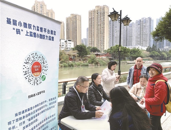 福建省福州市鼓樓區紀委監委通過線上線下相結合方式,宣傳推廣基層小微權力監督平臺,引導群眾參與監督、表達訴求,打通基層監督“最后一公里”。圖為近日,鼓樓區水部街道紀工委工作人員在公園向居民介紹相關情況。 王奕舒 攝