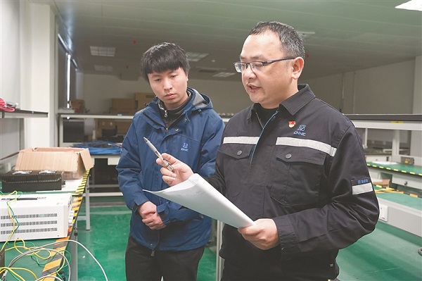 圖為霞浦核電維修處儀控科自控一班班長譚勇(右)和同事圍繞設備故障問題進行實驗討論。 霞浦核電供圖