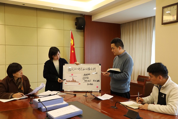 浙江省金華市紀(jì)委監(jiān)委聚焦“指尖上的形式主義”,成立工作專班,開(kāi)展專項(xiàng)整治,切實(shí)為基層減負(fù)松綁。圖為工作專班人員對(duì)“指尖上的形式主義”問(wèn)題進(jìn)行分析。 王妃 攝