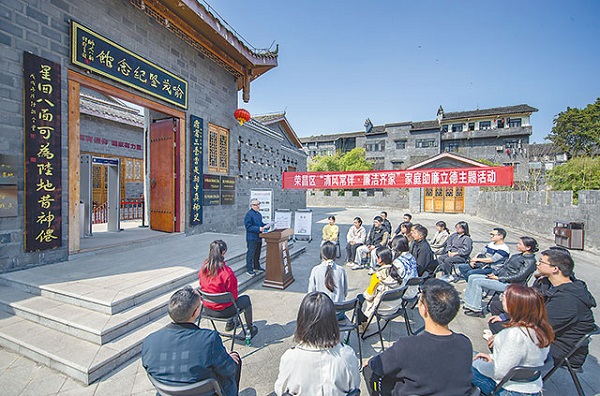 重慶市榮昌區紀委監委聯合區婦聯等單位開展“清風常伴·廉潔齊家”家庭助廉立德主題活動,教育引導黨員干部注重家庭家教家風建設。圖為近日,講解員在喻茂堅紀念館門前為黨員干部及其家屬講述喻氏家族清廉家風故事。 張春連 攝